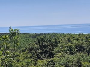 Wir fahren zuerst auf einer kleinen geteerten Straße Richtung Kranici. Über einen Schotterweg und einigen Höhenmetern gehts von Glusici weiter nach Skitaca. Auf diesem Höhenkamm mit überragenden Ausblicken erreichen wir den höchsten Punkt des Labiner Gebiets, Skitaca. Von dort kann man im Westen bei geeignetem Wetter die Umrisse Venedigs erkennen. Im Osten hat man einen sagenhaften Blick Richtung Kvarner Bucht mit der Insel Cres.