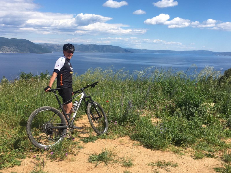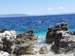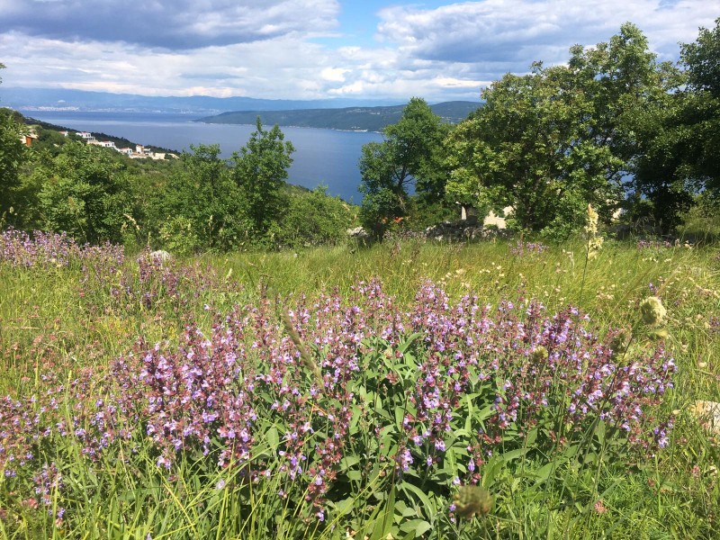 Der Badeort Rabac in der Kvarner Bucht bietet herrliche Felsstrände und Aussichten. Dort kann man gerade während der Pfingstezeit das Meer noch relativ alleine genießen. Das 17 Grad warme oder eher kühlere Wasser lässt die Sinne erwachen. Und diese Sinne (visuell, auditiv, haptisch und olfaktorisch) werden bei jeder MTB-Tour in Istrien zu dieser Zeit mehr als aktiviert. Die Luft ist voller Düfte, weil um diese Zeit (Mitte Mai bis Mitte Juni) die mediterrane Vegetation zum Leben erwacht. Und die Wiesen voller Farbenpracht.